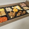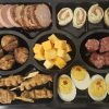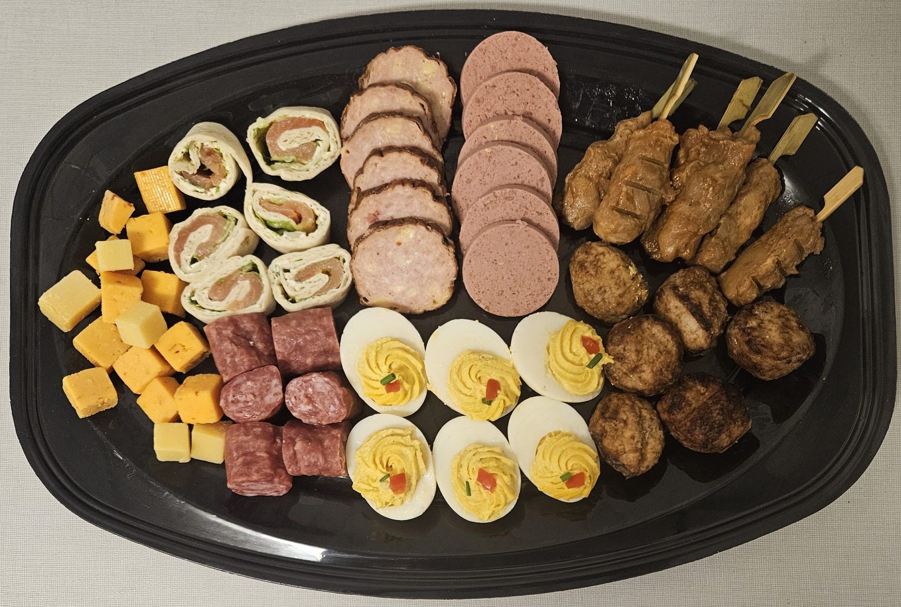Inhoud: 5 x Balletje 5 x Gevuld ei 5 x Leverworst 5 x Tapas saté 5 x Grill worst 5 x Droge worst 5 x wrap met zalm 12 x kaasblokje Filet american Kip kerrie salade Toast Kruiden crème Dipstokjes