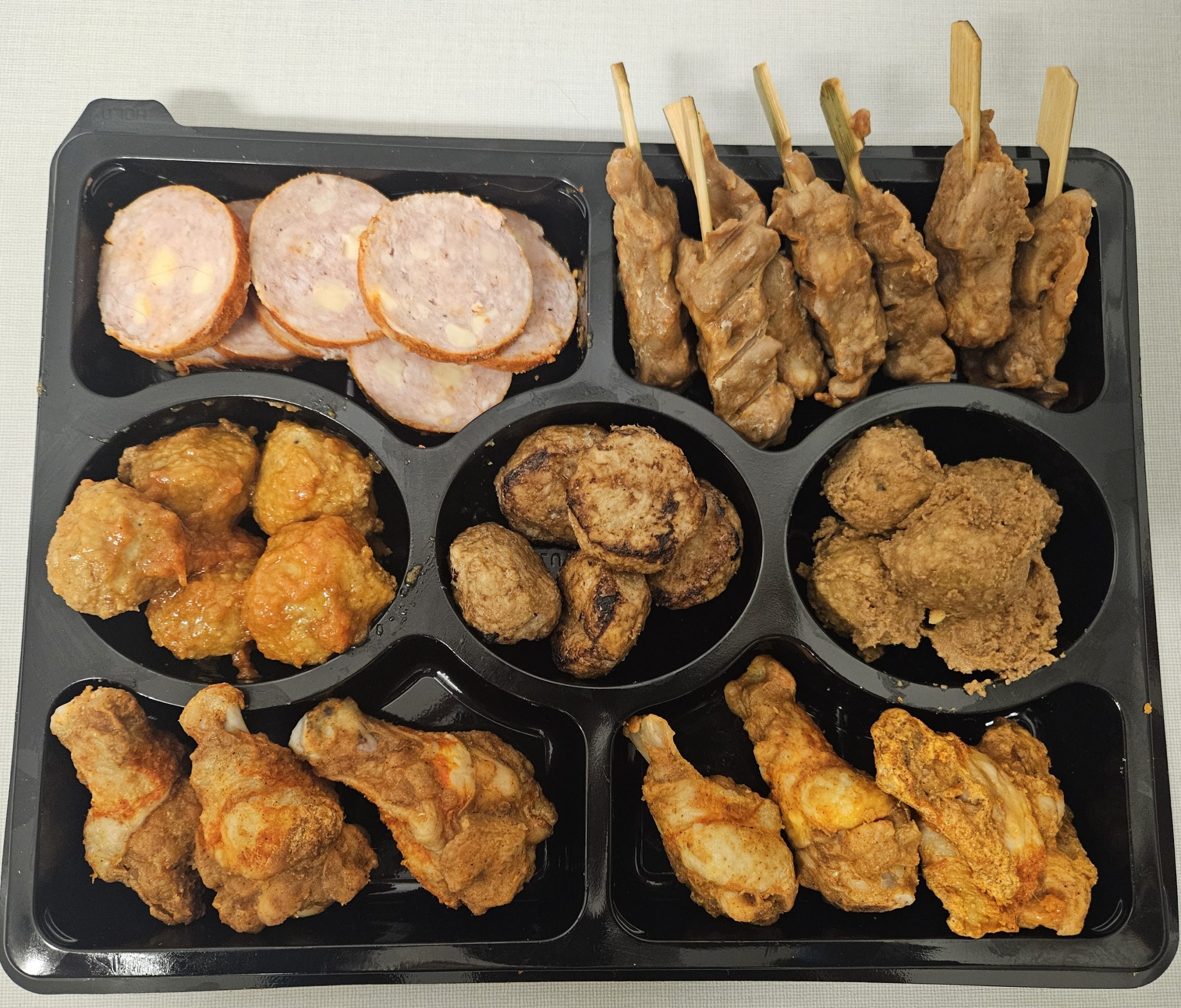 Inhoud: 5 x Balletje 5 x Gevuld ei 5 x Leverworst 5 x Tapas saté 5 x Grill worst 5 x Droge worst 5 x wrap met zalm 12 x kaasblokje Filet american Kip kerrie salade Toast Kruiden crème Dipstokjes