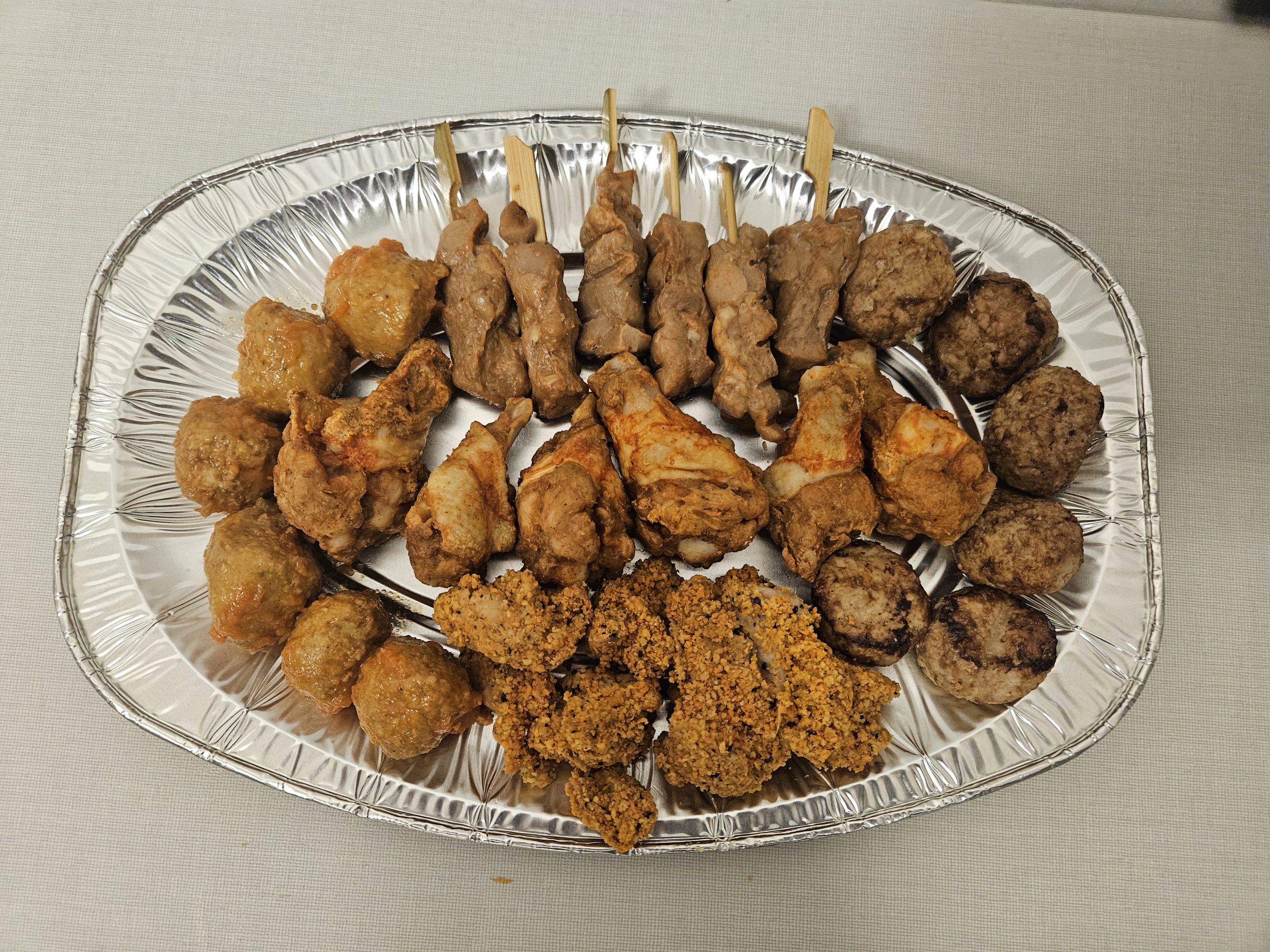 Inhoud: 5 x Balletje 5 x Gevuld ei 5 x Leverworst 5 x Tapas saté 5 x Grill worst 5 x Droge worst 5 x wrap met zalm 12 x kaasblokje Filet american Kip kerrie salade Toast Kruiden crème Dipstokjes