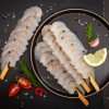Pakket met zalmmoot, heekfilet, tilapiafiet en een garnalenspies.